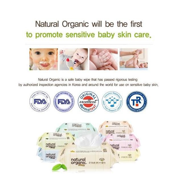 Natural Organic Baby Wipes is being produced with safe ingredients sed for cosmetics and its safety is certified from internal and external authorized testing institutions after going through more than 100 tests. It contains natural organic active complex for dry and sensitive baby skin to keep in moisturized and healthy. As it is natural ingredients for precious baby's skin, you can use it safely.