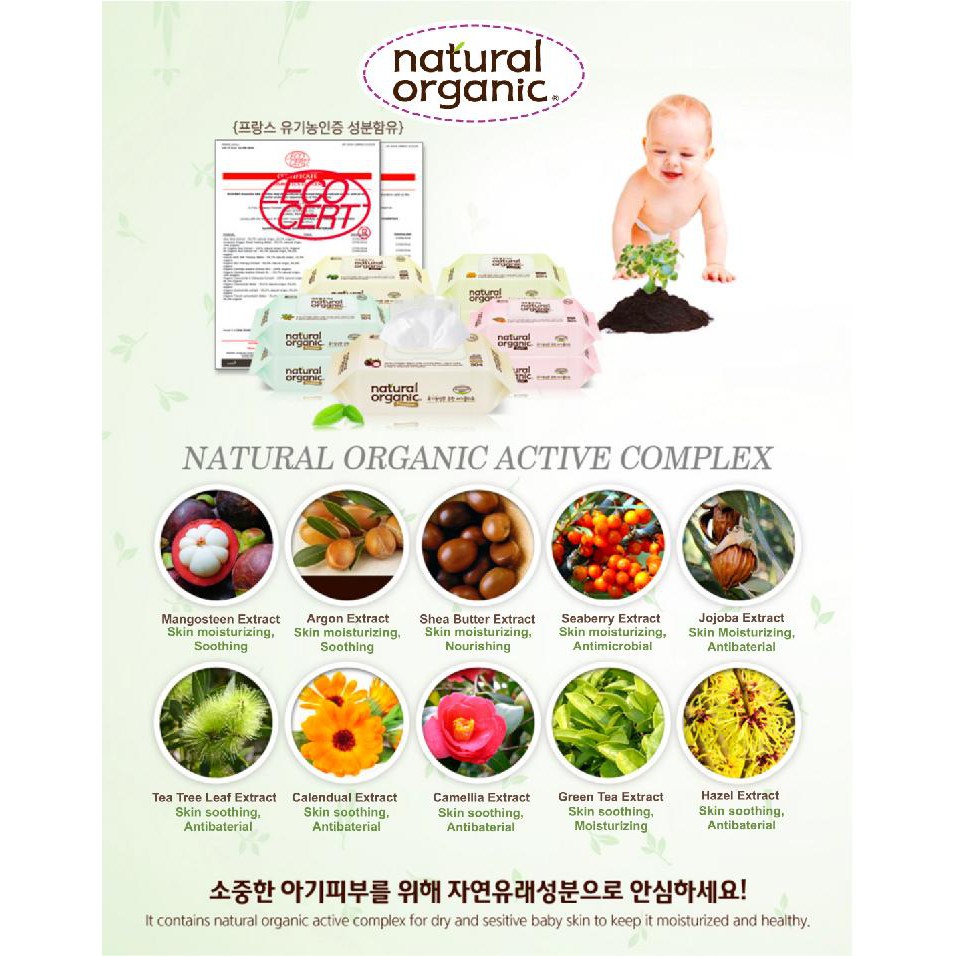 Natural Organic Baby Wipes is being produced with safe ingredients sed for cosmetics and its safety is certified from internal and external authorized testing institutions after going through more than 100 tests. It contains natural organic active complex for dry and sensitive baby skin to keep in moisturized and healthy. As it is natural ingredients for precious baby's skin, you can use it safely.